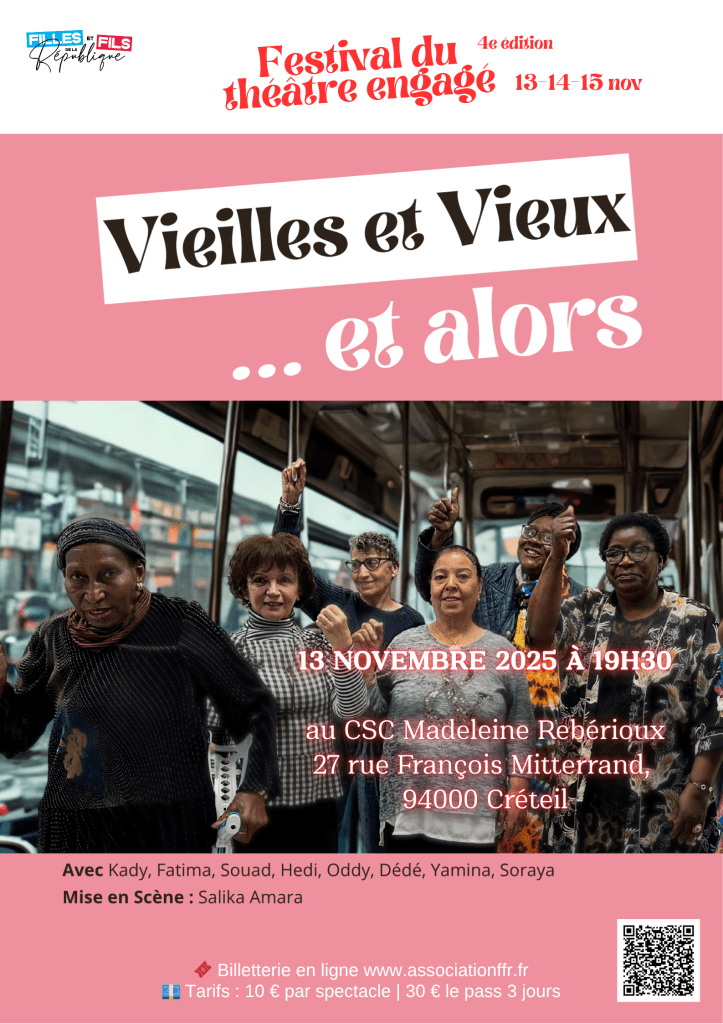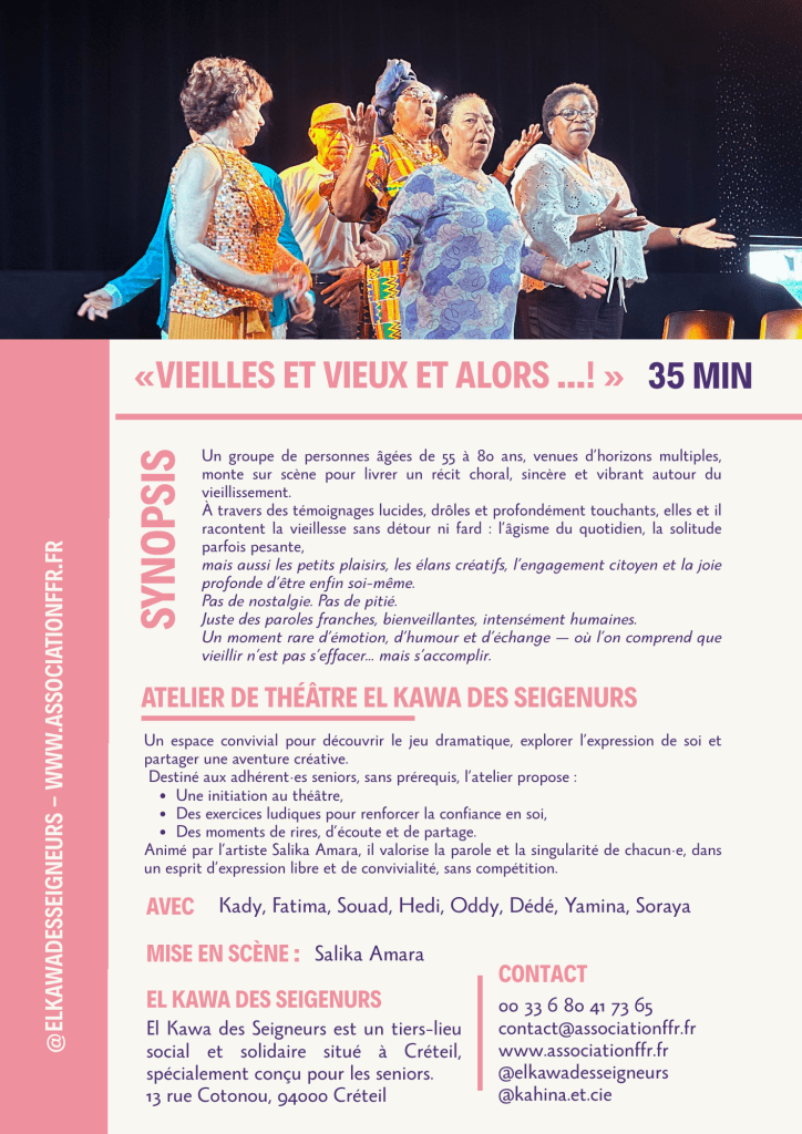 Un groupe de personnes âgées de 55 à 80 ans, venues d’horizons multiples, monte sur scène pour livrer un récit choral, sincère et vibrant autour du vieillissement. À travers des témoignages lucides, drôles, touchants, ils racontent la vieillesse sans détour ni fard : l’âgisme du quotidien, la solitude parfois pesante, mais aussi les petits plaisirs revenus, les passions toujours vives, l’engagement citoyen, et la joie profonde d’être enfin soi-même.